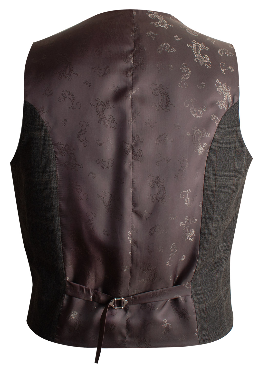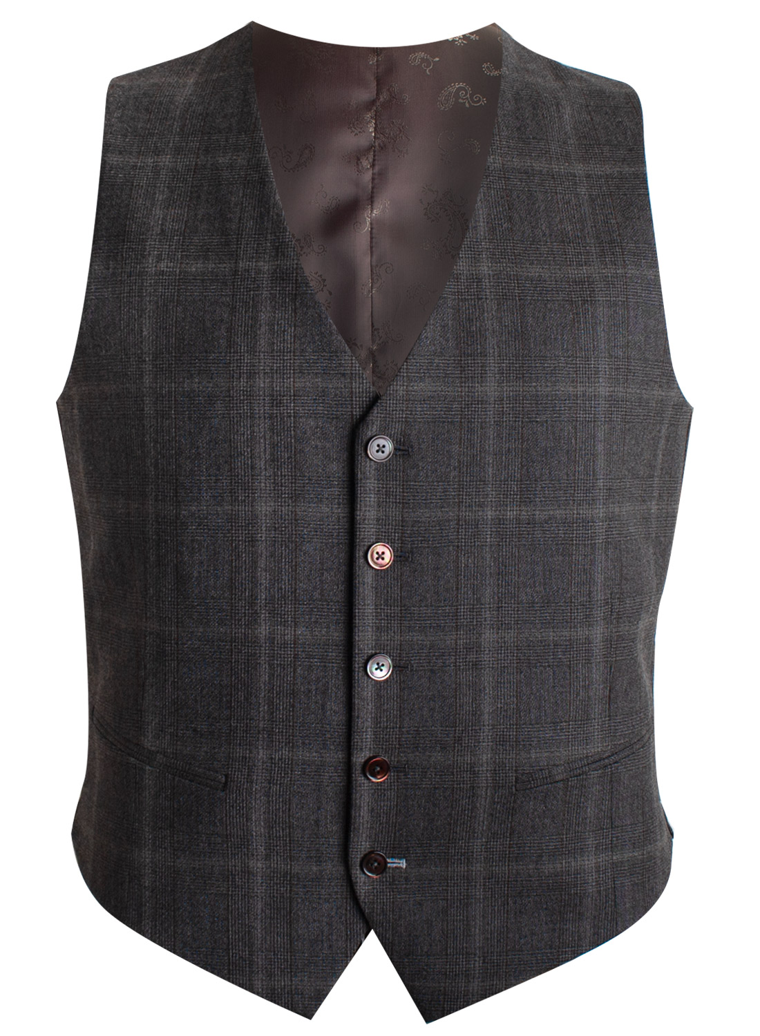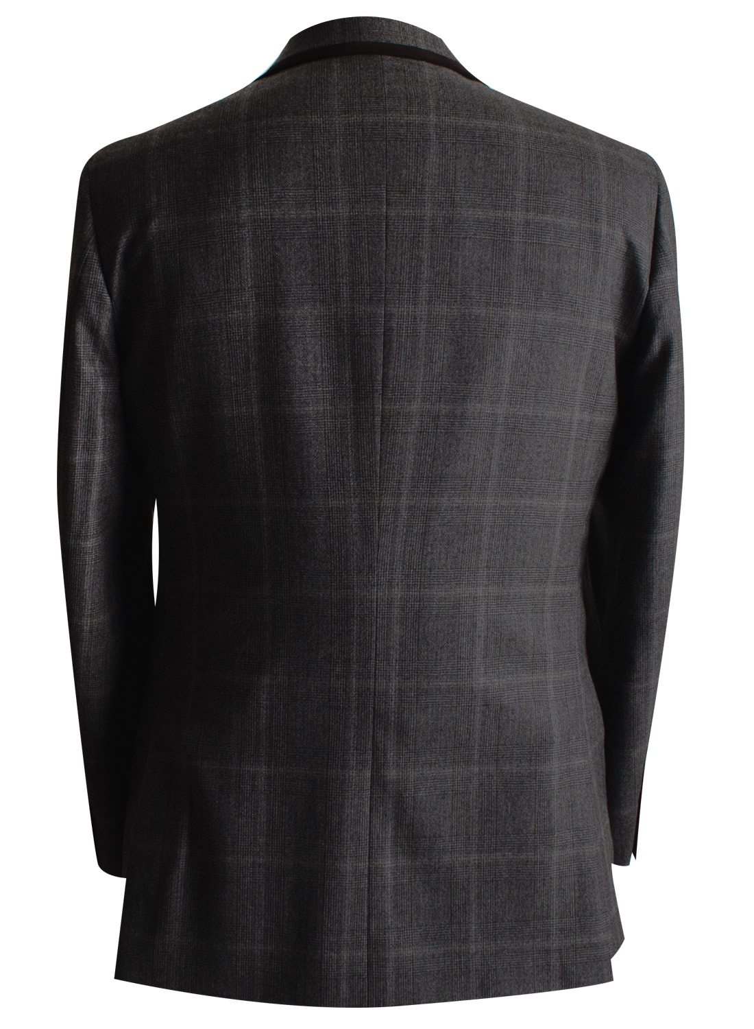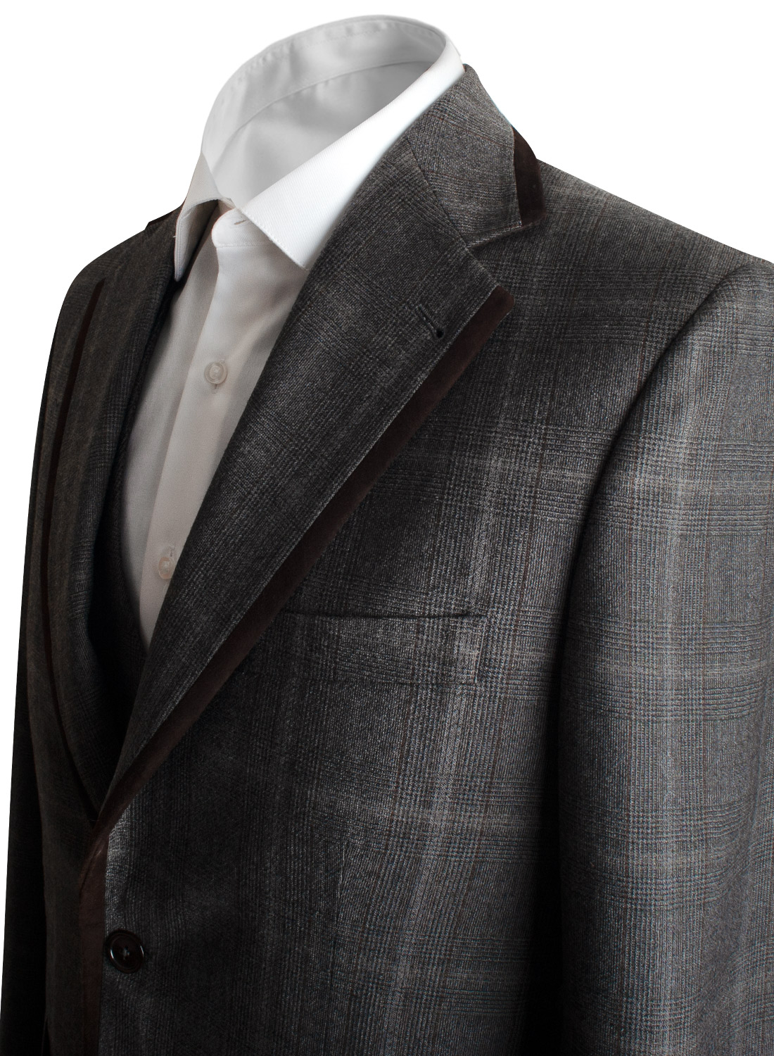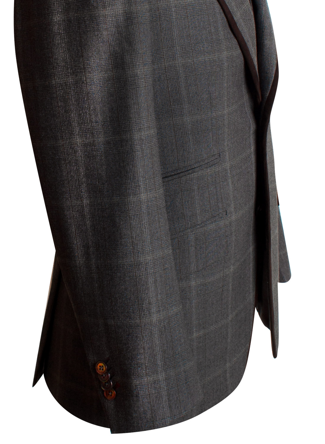 Elegant brown suede piping details and mother of pearl buttons make this glen plaid suit stand out in an iconic way.
