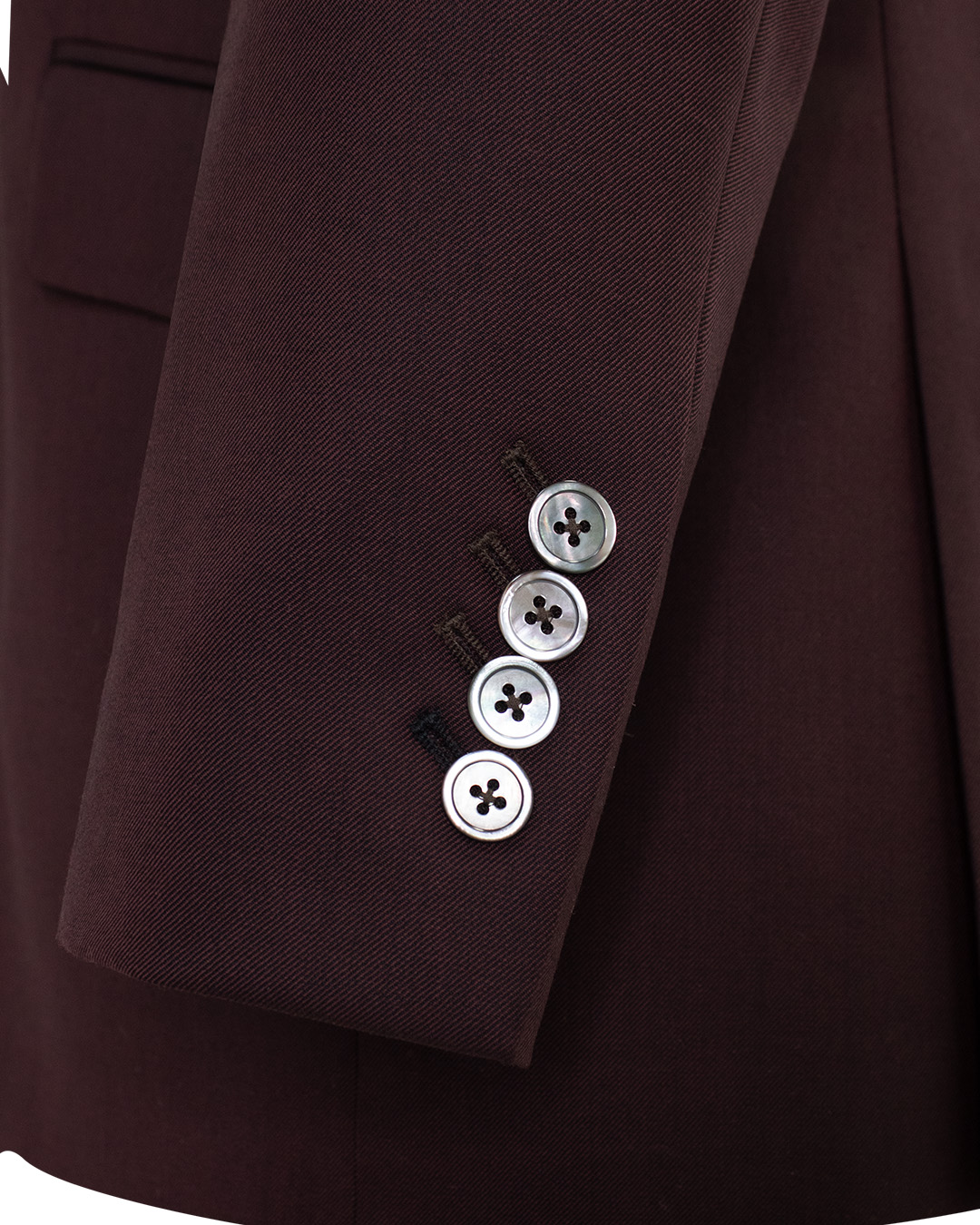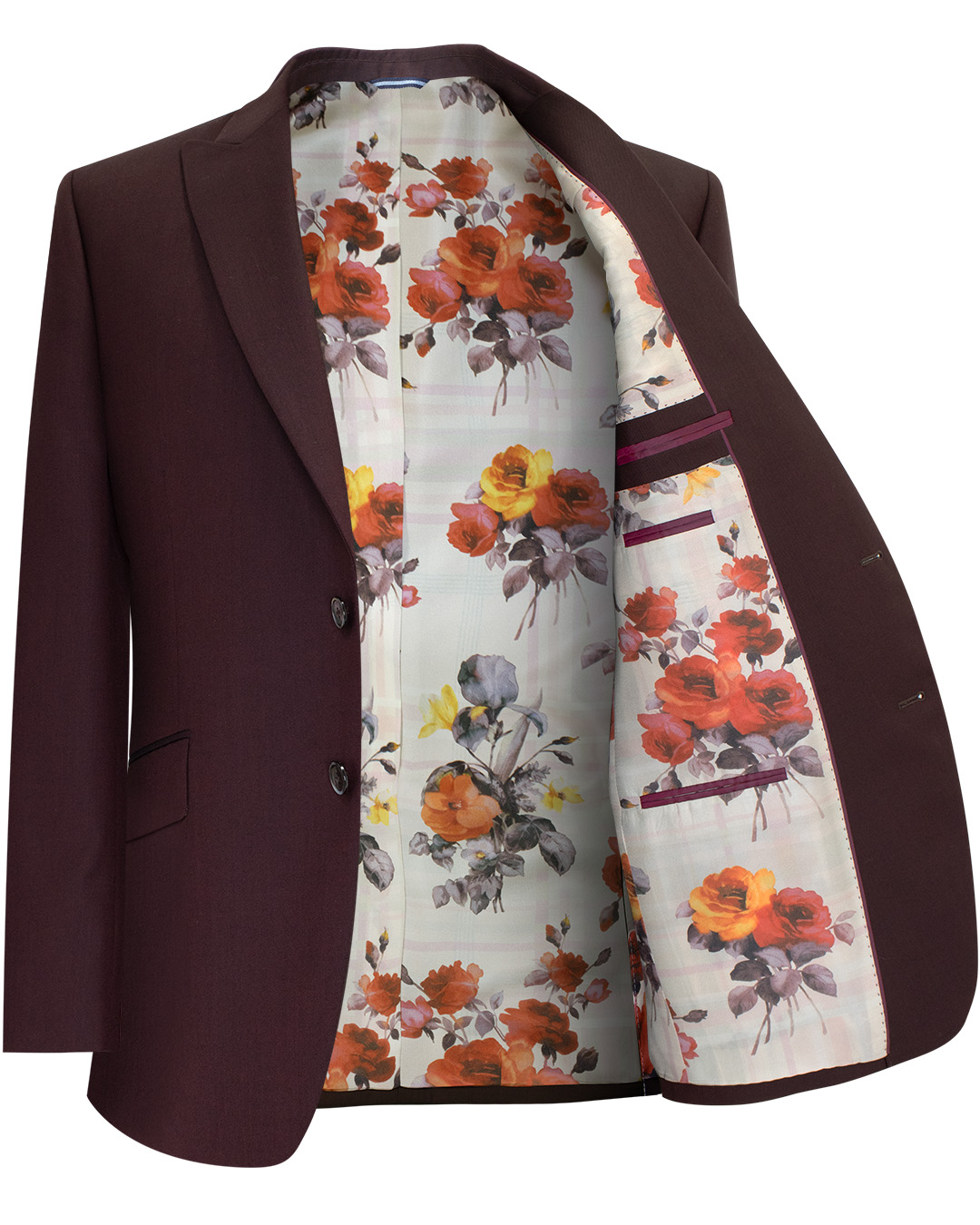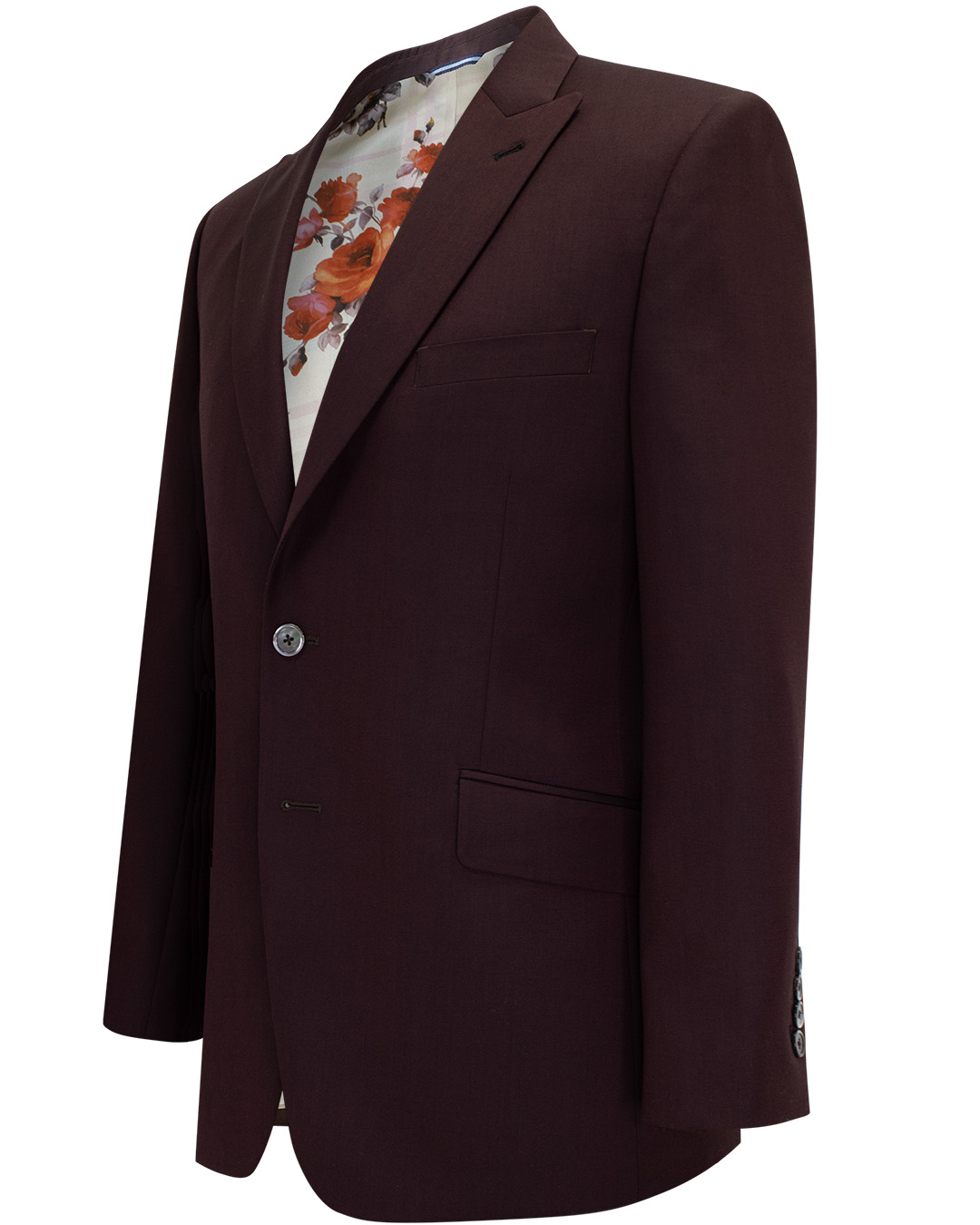 This burgundy jacket is crafted from a rich, lustrous fabric that catches the light just right. Tailored with 100% silk floral print lining, it reveals a hidden world of artistry and charm. Its clean lines and single-button silhouette create a commanding yet effortless presence.